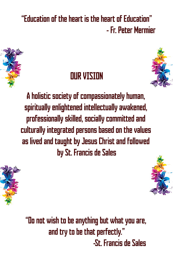 St. Francis de Sales, a saint of the Catholic Church, born on 21st August 1567, at Thorens near Annecy, France, is the patron of Saint of the Congregation of fransalians. He was ordained a priest on the 18th of December 1593 and was consecrated as a Bishop in 1602. Francis was a pioneer missionary to publish the printed word of God. In 1608 , he published the “Introduction to devout life” and the “Treatise on the love of God” in 1616. He was beatified in 1661 and cannonised in 1665. Pope Pius IX proclaimed him Doctor of the Church in 1877.